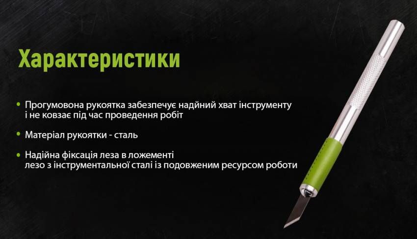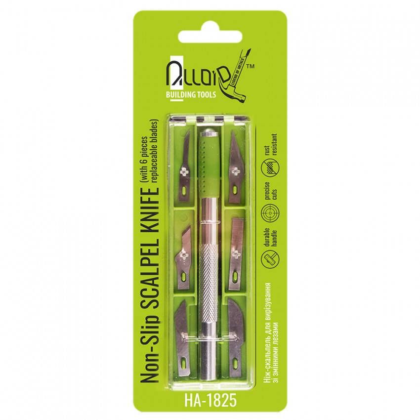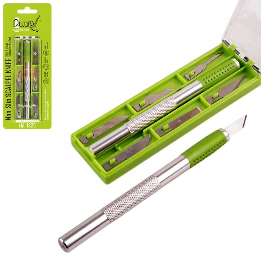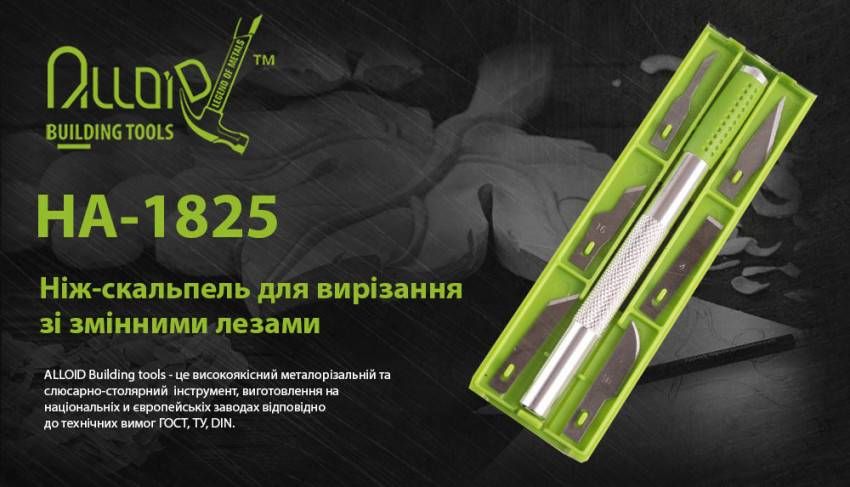 Скальпель-ніж Alloid НА -1825 виготовлений повністю з металу. Він має дуже гостре лезо і призначений для акуратної і точної різання паперу, картону. Також його можна використовувати для різання пластикових, гумових і навіть дерев'яних деталей в процесі побудови масштабних моделей.