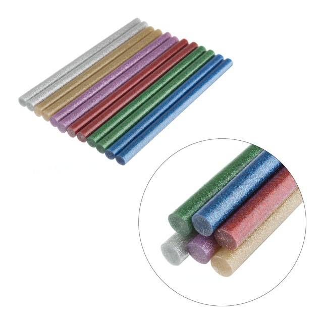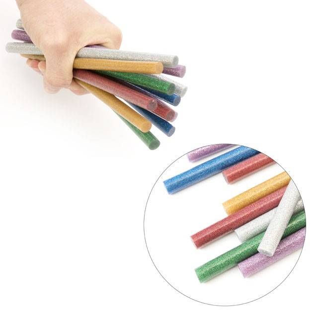 Кольорові клейові стержні з блискітками, в комплекті 6 кольорів: срібло, золото, червоний, бузковий, зелений, синій. Діаметр стрижня 7,4 мм - один із найпоширеніших і найпопулярніших розмірів, підходить до будь-яких марок клейових пістолетів. Сам стрижень довжиною 200 мм, в упаковці - 12 штук.
