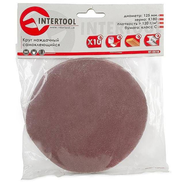 Круг наждаковий на липучці 125 мм, папір клас С, щільність 120 г/м², К180, 10 од. INTERTOOL BT-0518