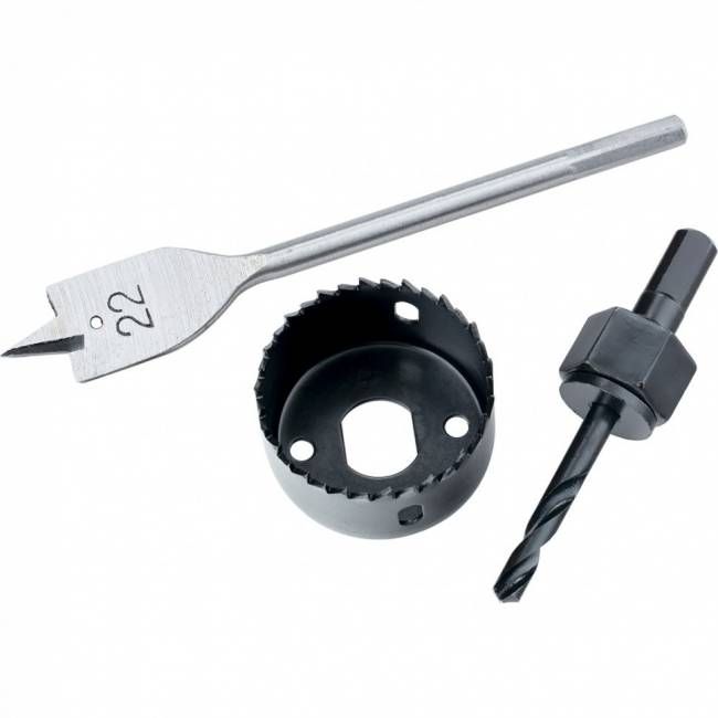 Виготовлений з вуглецевої сталі. Призначений для установки дверних замків з посадочними діаметрами ручки 48 і 55 мм і клямкою діаметром 22 мм. Комплектація: 704939 - коронка 48 мм з напрямним свердлом, перове свердло 22 мм