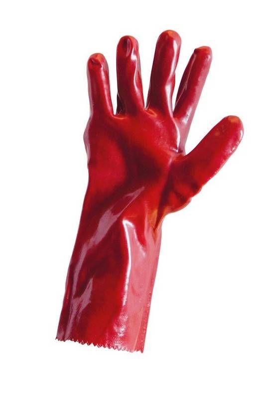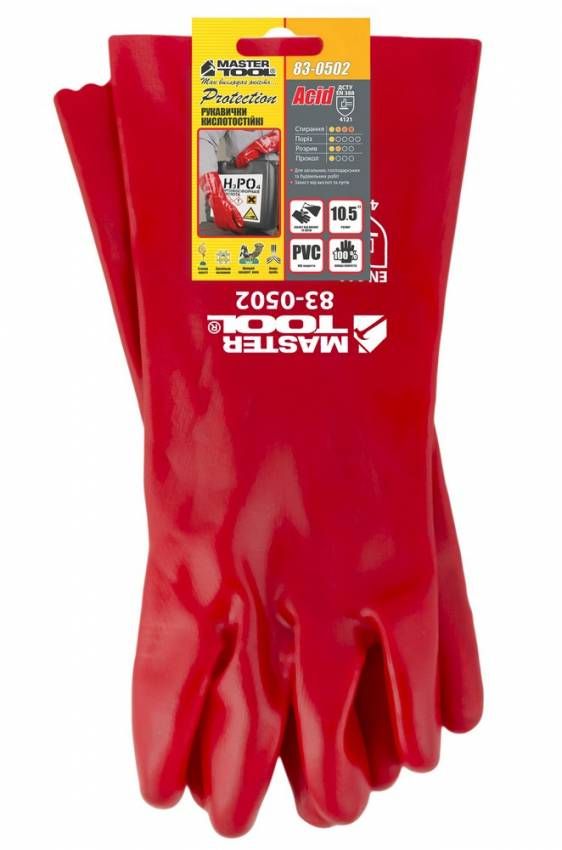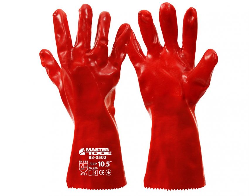 Рукавички кислотостійкі MASTERTOOL бавовняний трикотаж повне ПВХ покриття манжет крага 350 мм 10.5" 185-190 г червоні 83-0502
