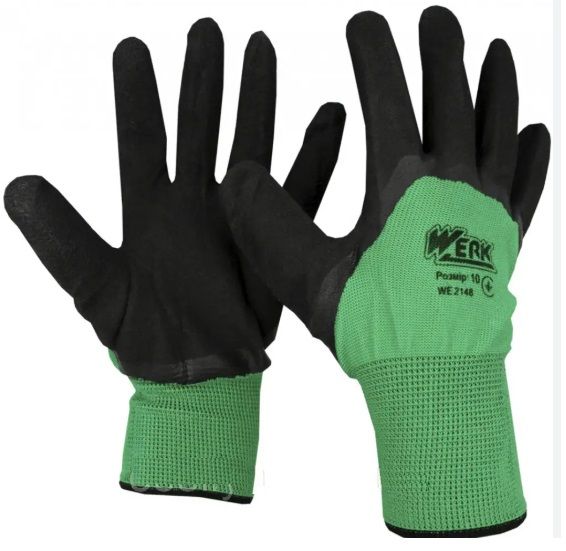 Рукавички полiестер, зелений колiр, латексне покриття (чорне), оверлок на манжетi чорного кольору, р.10 WERK (WE2148) 118786