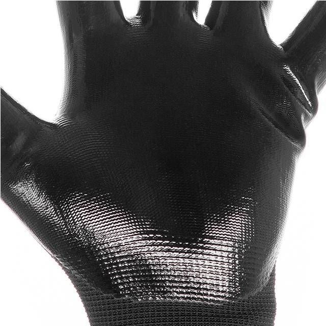 Покриття на долоні – чорний нітрил для стійкішого захисту рук від забруднень та механічних пошкоджень. При цьому рукавички дуже еластичні та не сковують рухів пальців. Стійкі до стирання та мають тривалий термін експлуатації.