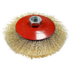 Щітка конічна Vitals гофрована латунована 100 мм М14, 0,3 мм призначена для обробки дерева, зняття фарби, шліфування металу, зняття іржі, обробки зварювальних швів.