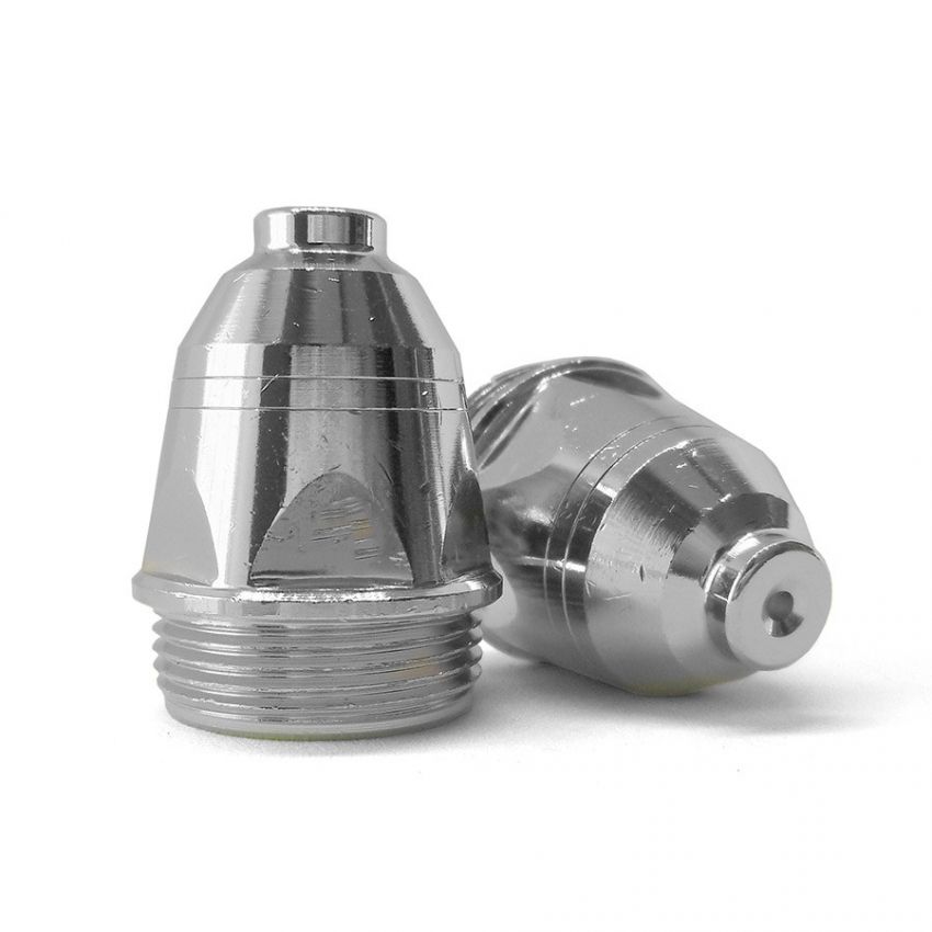 Сопло до плазмотронів P-80 (Panasonic) і їхніх аналогів. Сопло нарівні з електродом найбільш часто потребує заміни при активному використанні. Термін служби сопла залежить від цілого ряду факторів, найбільш вагомі з яких це: тип матеріалу, що розрізається (склад і товщина), якість плазмоутворюючого газу (повітря у разі повітряно-плазмового різання), точність виготовлення і особливість конструкції плазмотрона, правильний підбору режиму різання і типу комплектуючих. Пошкоджене сопло, часто служить причиною неякісної різання. Також, якщо підібрано сопло з меншим номіналом по робочому струму, то термін її служби значно скоротиться порівняно з номінальним. При оптимальних умовах комплекту матеріалів «сопло-електрод» вистачає на 20-40 м якісного різання (в залежності від типу матеріалу, що розрізається). Щоб забезпечити якісне різання рекомендуємо замінювати сопло і електрод одночасно. Сопла ТМ Welding Dragon виготовлені з мідного сплаву, на поверхню якого нанесено захисне нікелеве покриття. Шановні покупці! Будьте уважні при замовленні сопел до плазмотрону! Залежно від струму різання різниться діаметр вихідного отвору. Щоб уникнути помилок, використовуйте таблицю: Діаметр Струм різання 1.1 мм 40 А 1.3 мм 60 А 1.5 мм 80 А 1.7 мм 100 А
