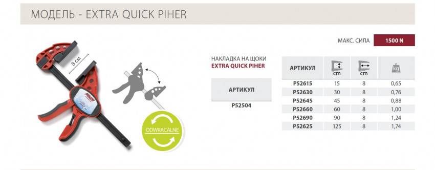 Струбцина столярська Extra Quick PIHER-45 см (щелепа 8 см, накладка 7,4 см)