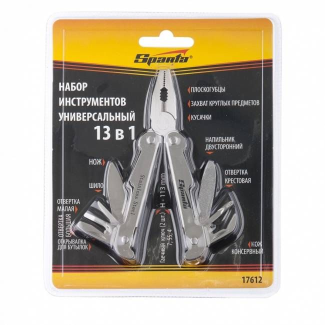 _x000D__x000D_Универсальний набор инструментив._x000D__x000D_Розмир в рабочем положении 113 мм._x000D__x000D_У комплект входят: плоскогубцы, кусачки, захват круглых предметов, крестовая отвертка, консервный нож, открывалка для бутылок, отвертки шлицевые средняя и малая, пила, шило, напильник, большой ниж._x000D__x000D_Незаминний в поїздки за місто, на пікнік, полювання, риболовля. Компактний, багатофункціональний та зручний.
